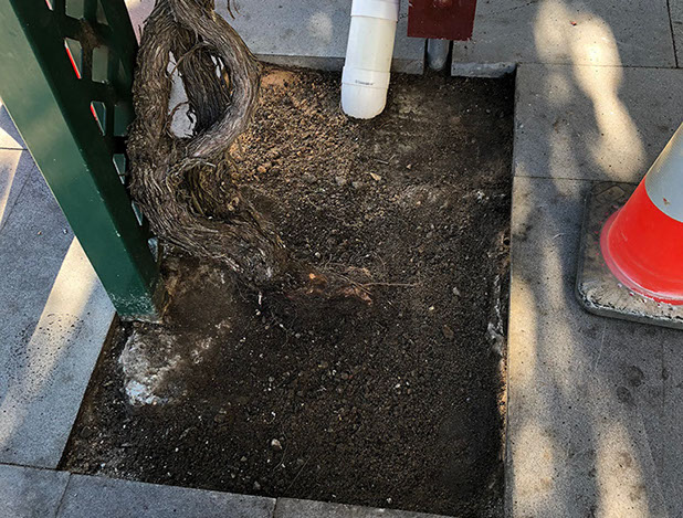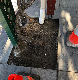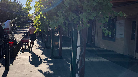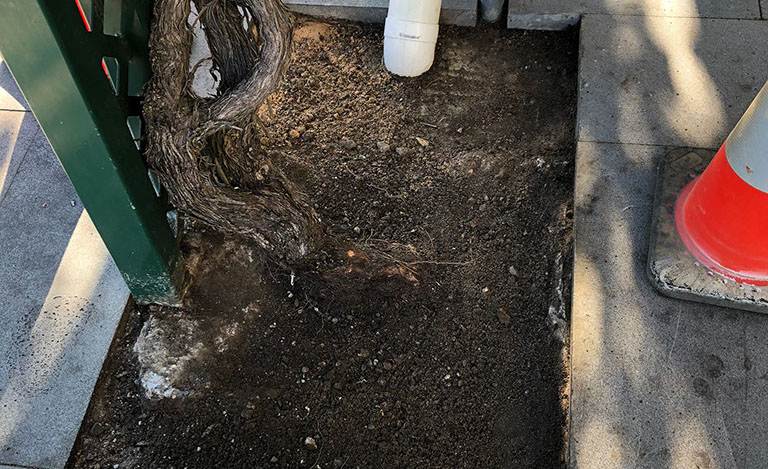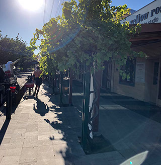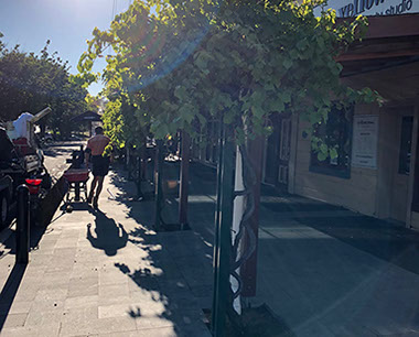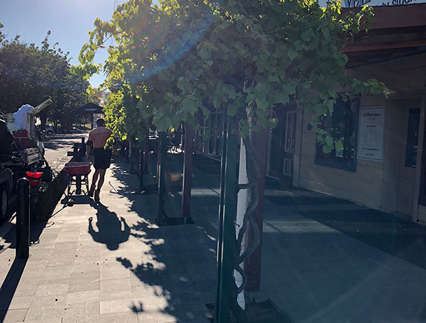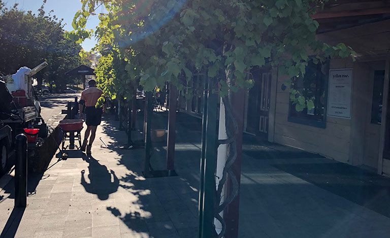 Above the seatings areas for the cafés, Grape vines grow and thrive giving shade and colour in the canopy. These Vines grow from areas of exposed soil within the paved area. The purpose of our works was to provide a mulch that did not migrate and allowed water to permeate to the roots. Also to avoid litter entrapment and give a quality look and finish.