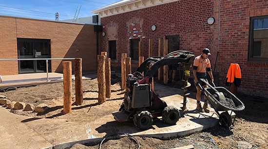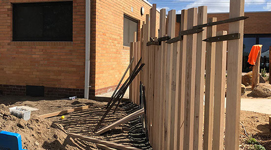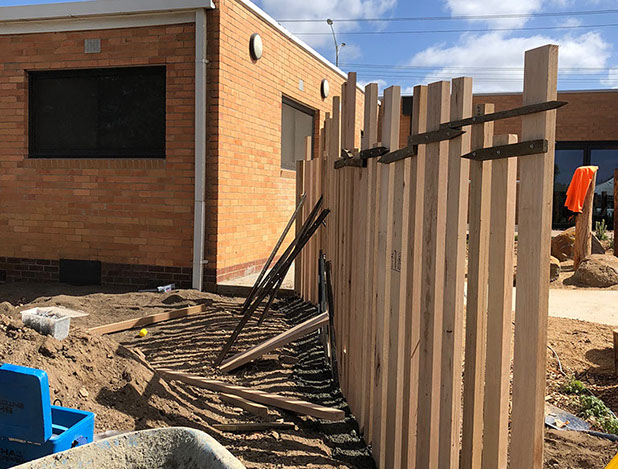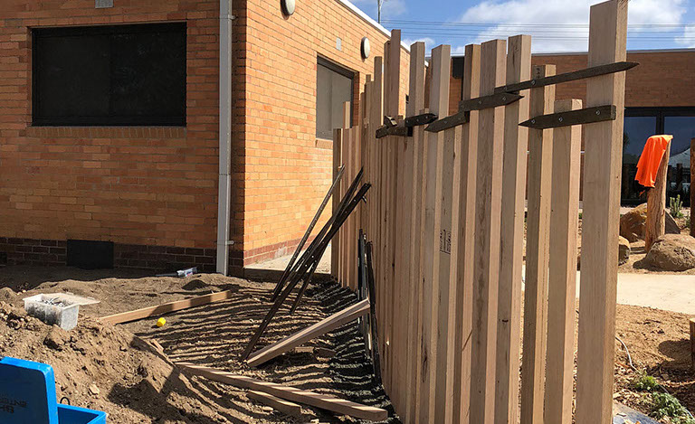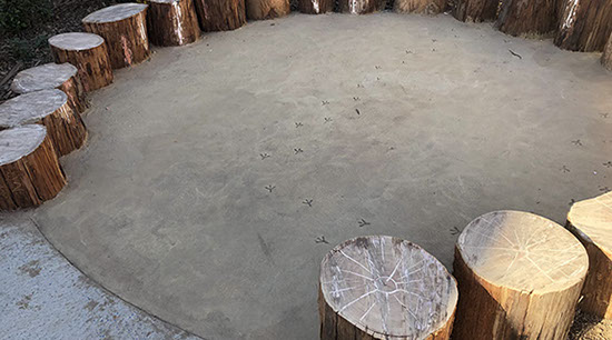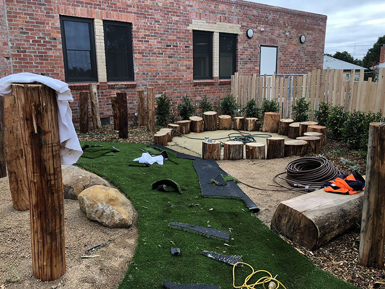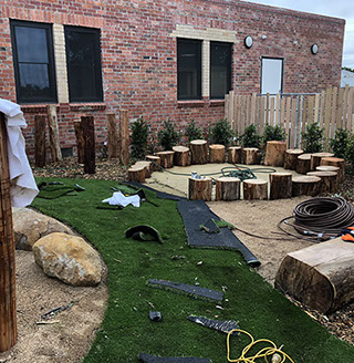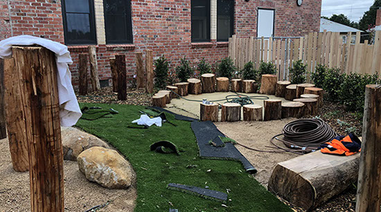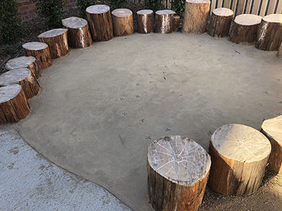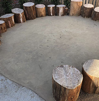 stories being read in the story telling circle. We constructed and installed wiggly paths covered in Astro turf, Painted poles and log seats.
