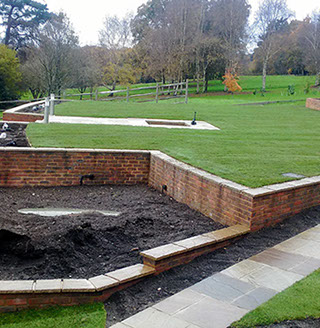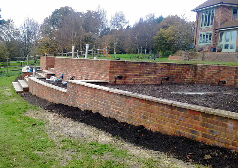 We agreed that the way forward would be to put curved walls in at 2 levels to reduce the overall height. Also to install a grand staircase leading onto the lower garden and a terrace area with a pond and water feature.
