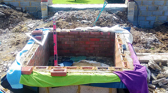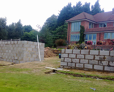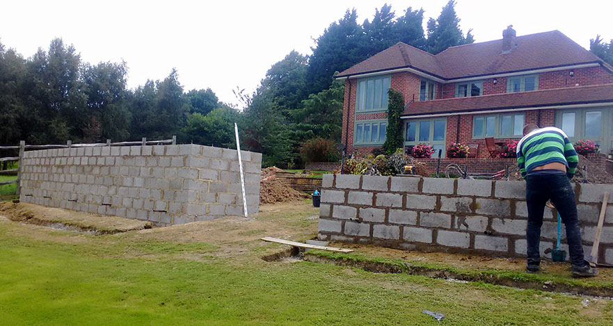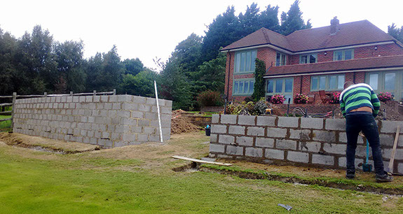 We started but excavating the footings and filling with concrete and upright reinforcing steel bars. After the concrete had dried we started to erect a hollow concrete wall to desired heights. Once finished these were filled with concrete.